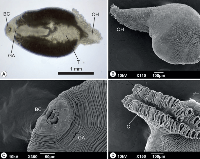 2. 크기와 형태: 아가미흡충의 크기는 대략 0.8~2.0mm x 0.2~0.4mm 정도이며, 머리부분에는 4개의 돌출부와 2개의 안점(눈과 유사한 구조)이 있습니다. 또한, 후부에는 14개의 작은 갈고리와 중앙에 2개의 큰 갈고리를 가진 고착기가 있어 숙주의 아마기에 부착합니다.