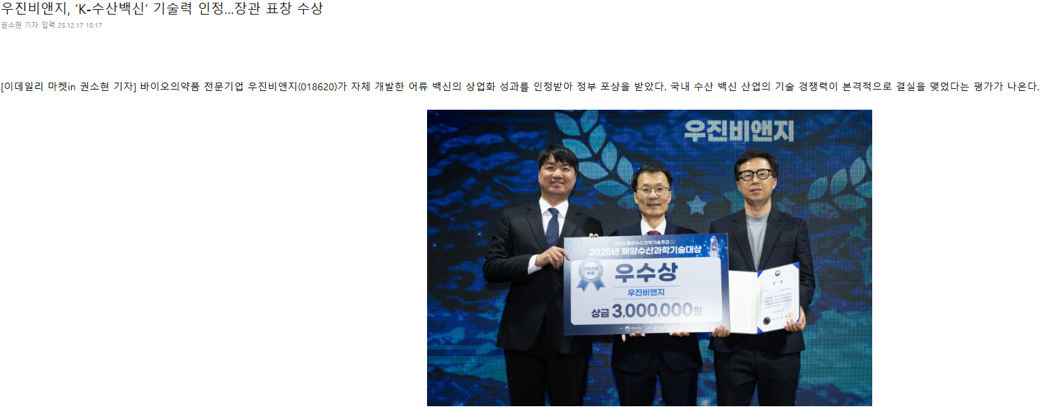 국내 기업 우진비앤지가 이리도바이러스 백신(이뮤니스® 메가백) 기술로 해양수산과학기술대상 장관 표창을 받았습니다.