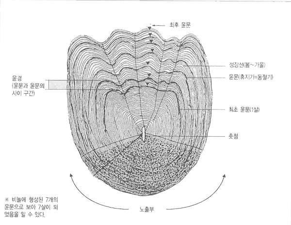 - 겨울 (먹이 적음) → 성장 느림 → 고리 간격 좁음