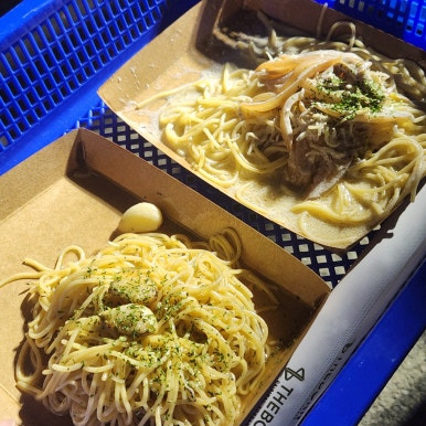 멸치파스타와 거의 두시간 기다려 받은 멸치김밥, 축제 마지막날 방문해 먹었던 비빔만두와 분식류입니다