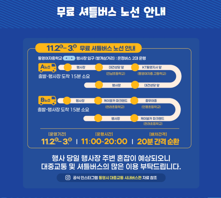 통영시는 관광객의 편의를 위해 행사장 주변 7개 초, 중, 고등학교에 임시 주차장을 마련하고 셔틀버스를 운행했다.