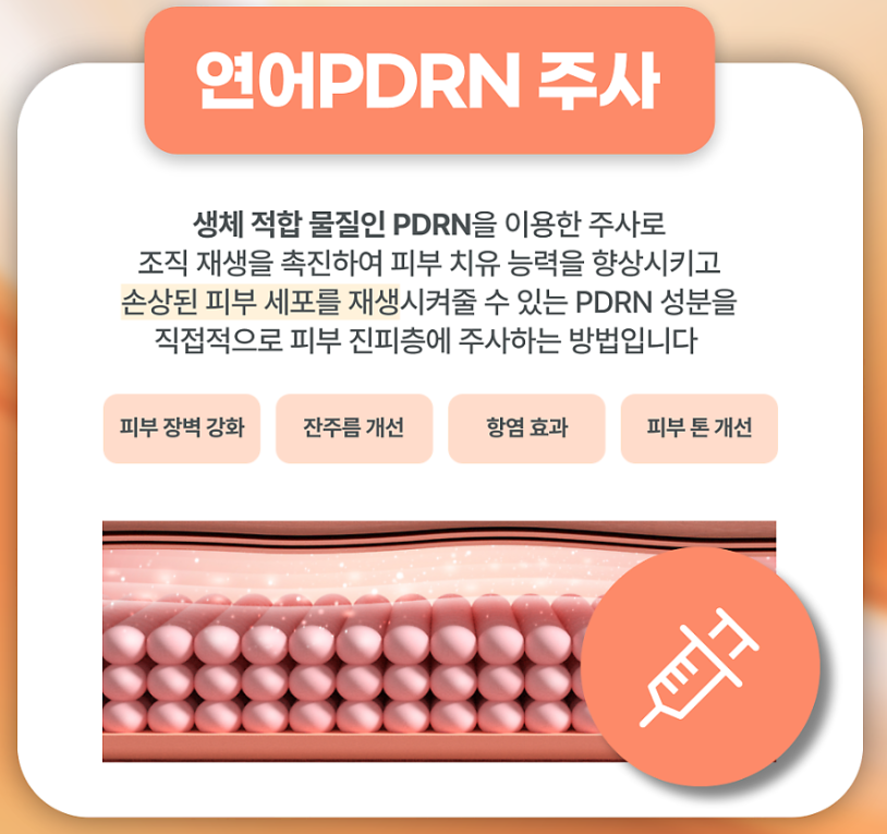 PDRN은 연어의 정소(신생세포) 속 DNA에서 주직재생성분을 가진 물질을 추출해 피부에 주사하는 시술입니다.