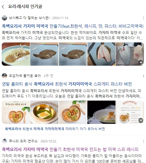 그 덕에 방송 후 흑백요리사 가자미 미역국을 만들어 보는 사람들의 레시피를 보면 꽤나 다양합니다.