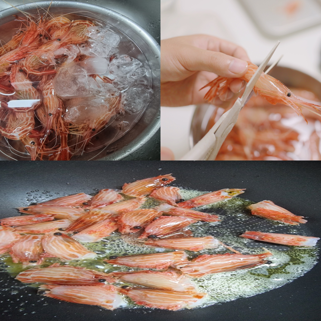 3. 냉동 새우 손질: 냉동된 독도새우는 사용하기 전에 미리 해동합니다. 해동 후에는 흐르는 물에 살짝 헹구고, 꼬리와 껍질을 제거한 후 등 쪽의 내장을 이쑤시개로 빼냅니다.
