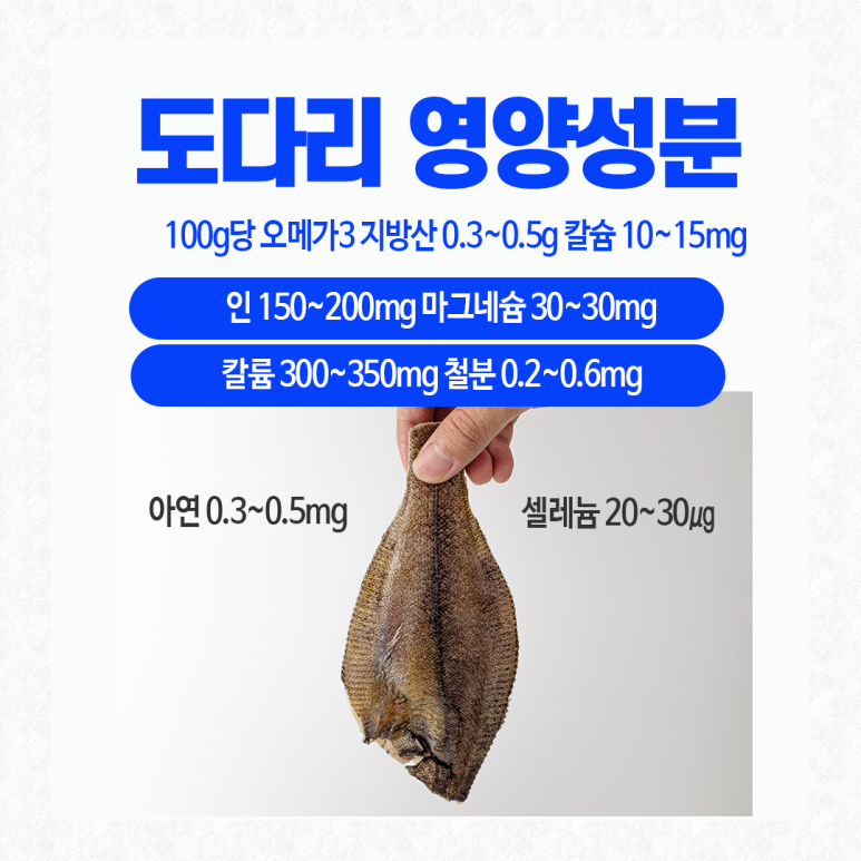 - 비타민과 미네랄: 도다리에는 비타민 A,B군, C,E와 같은 다양한 비타민과 칼슘, 철분, 칼륨, 마그네슘 등의 미네랄이 풍부합니다 이는 면역력 강화, 피부 건강, 뼈 건강에 도움을 줍니다.