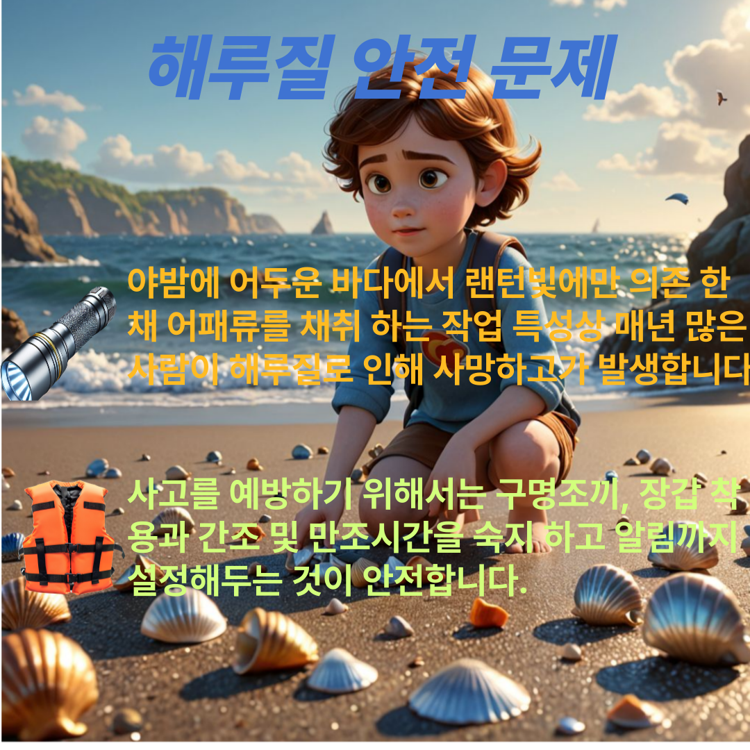3. 혼자 다니지 않기: 가능한 한 여러 명이 함께 다니며 서로의 안전을 확인합니다. 혼자서 해루질을 하면 위급 상황에서 도움을 받기 어렵습니다.